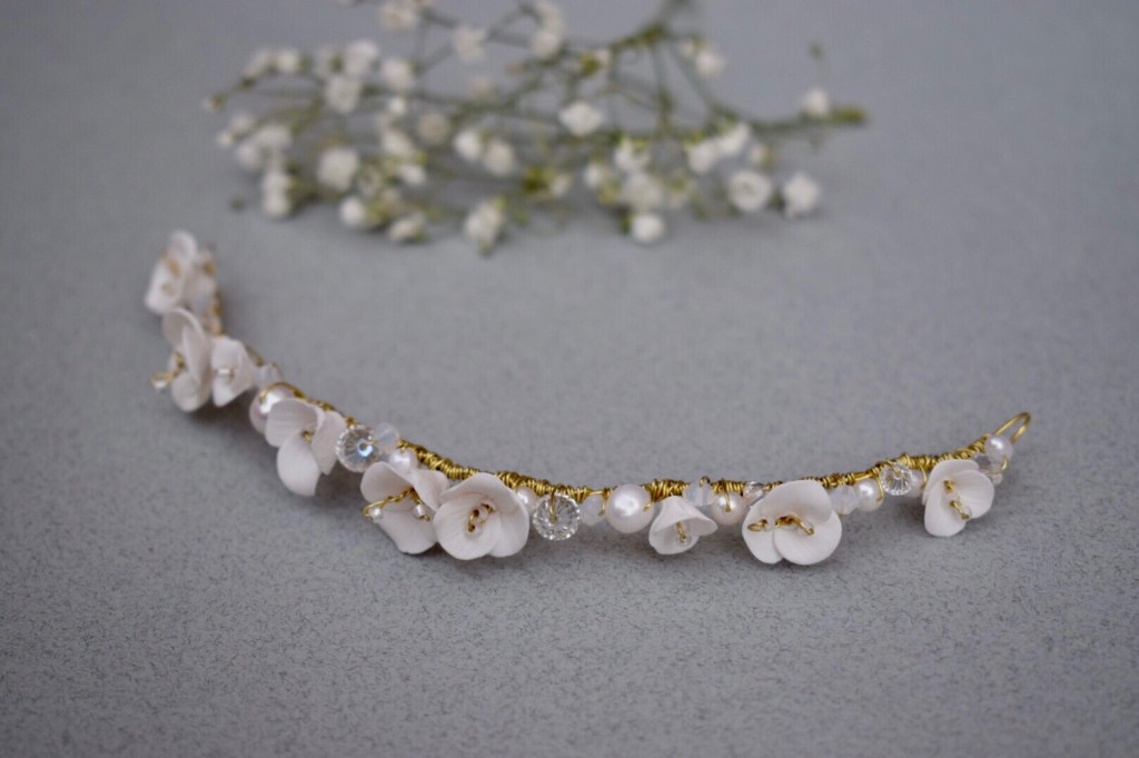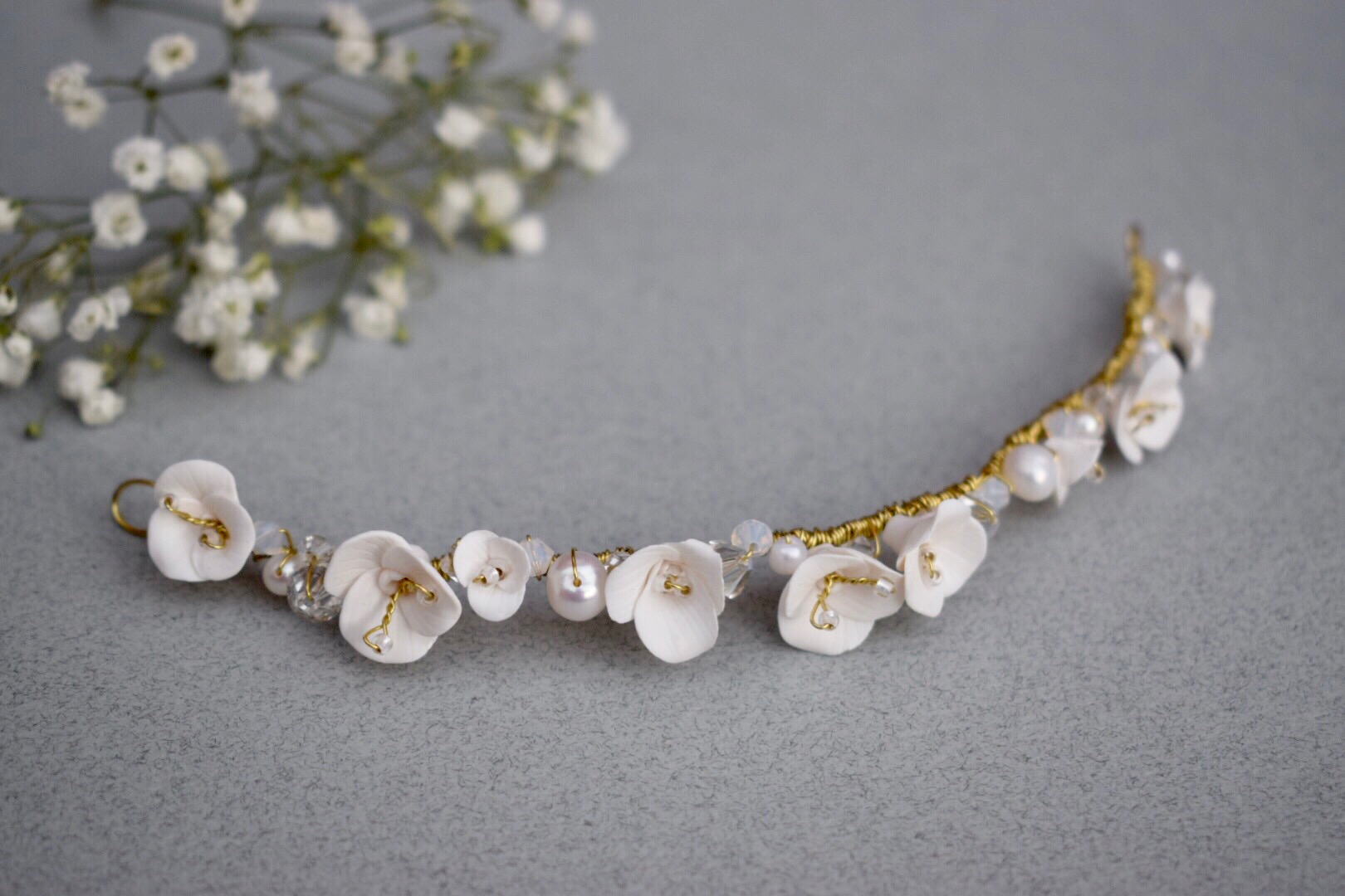 The Gladys vine is a little shorter than other vines. Packed with handcrafted white clay flowers, Swarovski Crystal and freshwater pearls. Perfect for adding a little touch of sparkle and loveliness to your chosen style. This vine is best suited to a pretty up do, or half up-half down style.