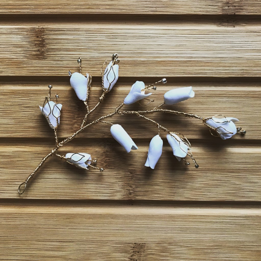 The Viola vine. Created with handcrafted white clay flowers and buds with wire leaf detailing.
